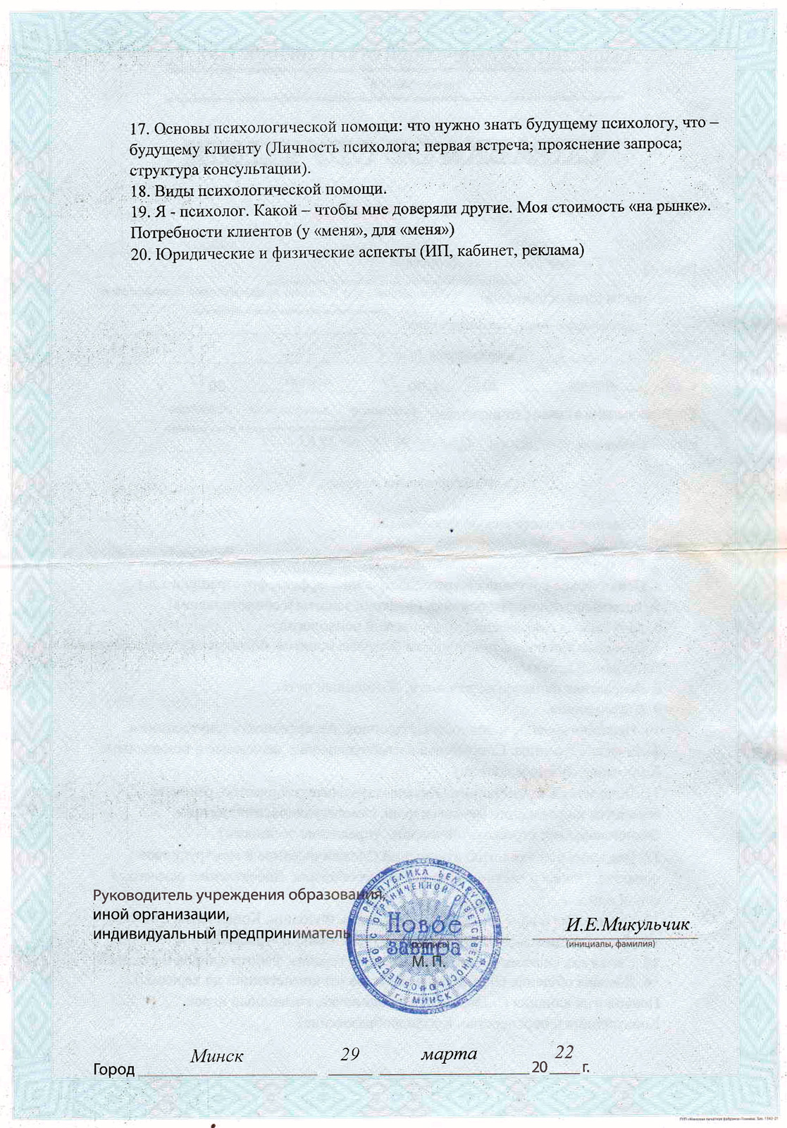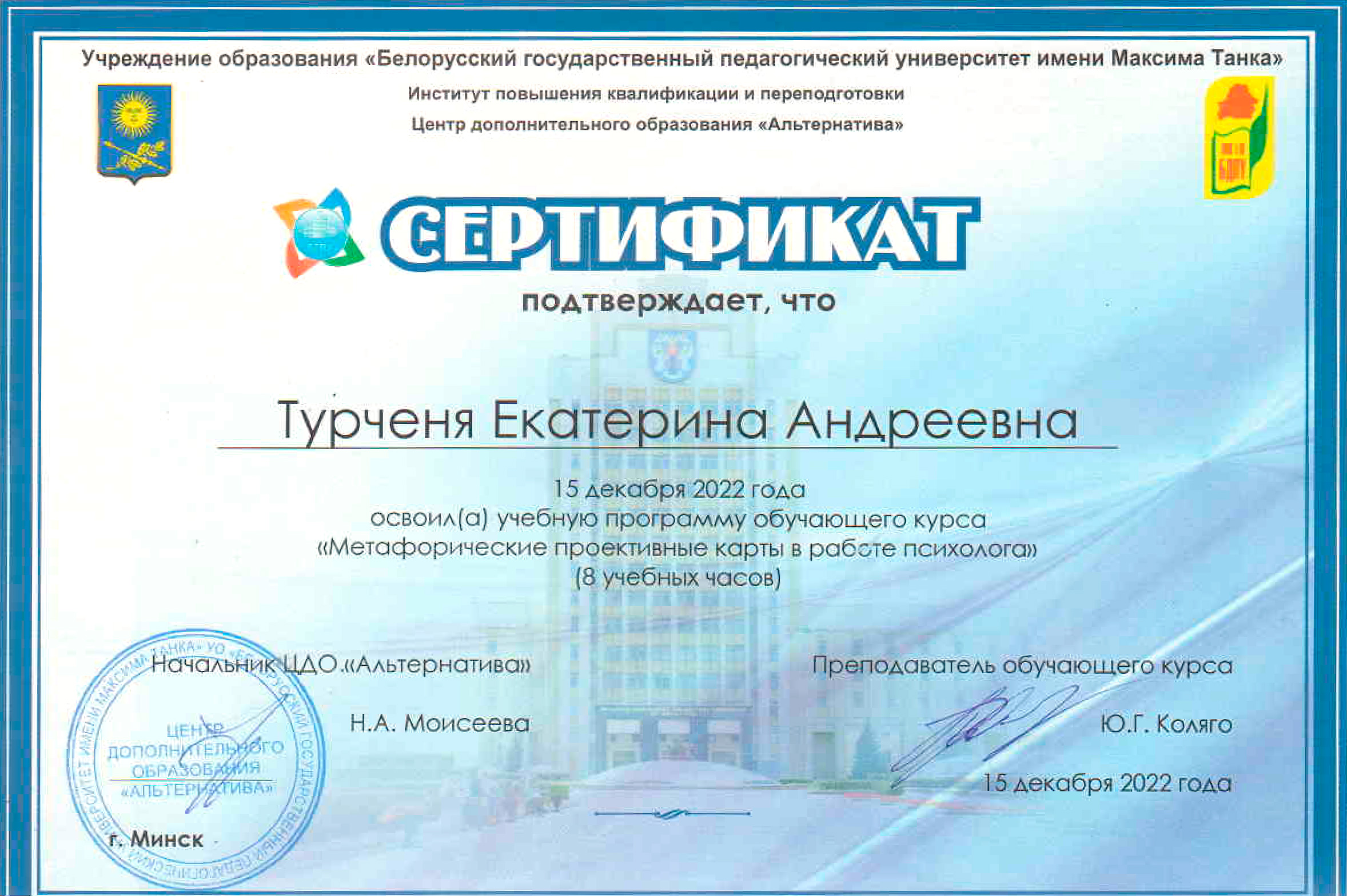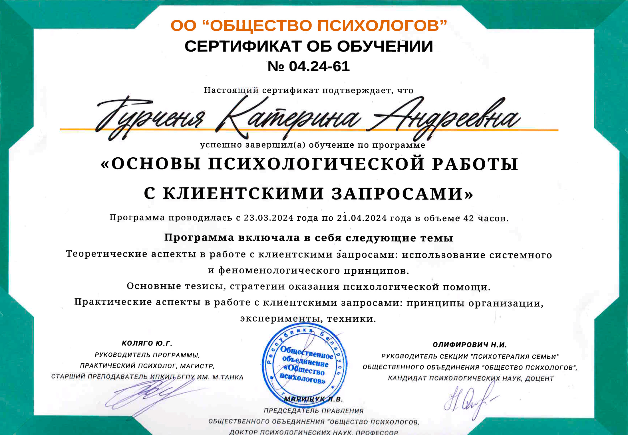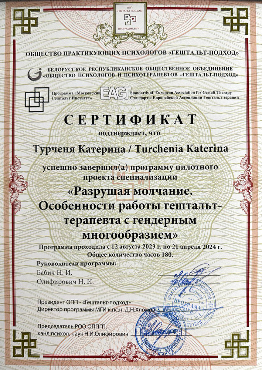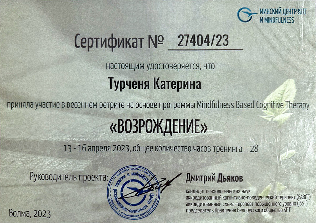 Мое образование поддерживаю постоянным обучением: более чем 400 часами специализированных тренингов в области КПТ и коучинга, Гештальт-обучения (200+ часов), дополнительного образования в специализациях: